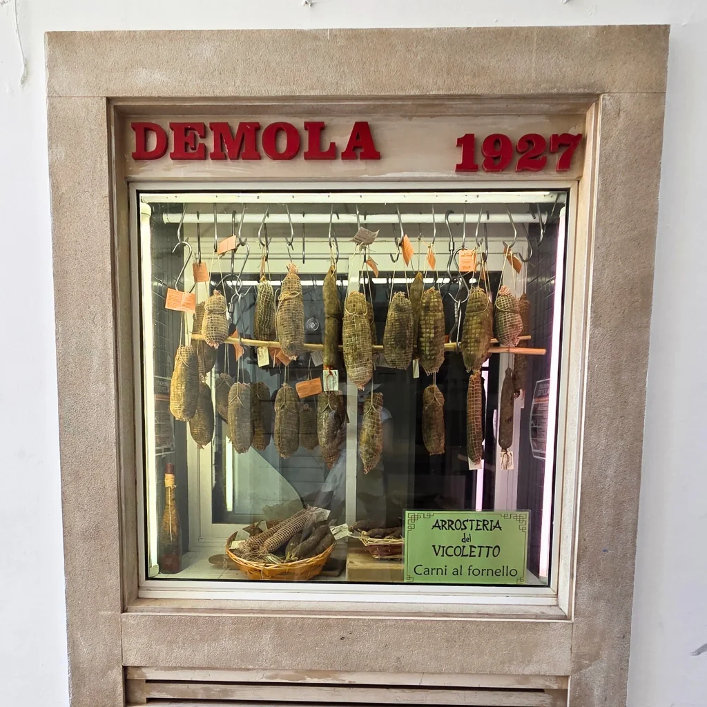 In the early evening, the mood shifts. Locals gather on the square, children play nearby, and the terraces slowly begin to fill. The scent of grilled meat drifting through the air reveals what Cisternino is truly famous for.