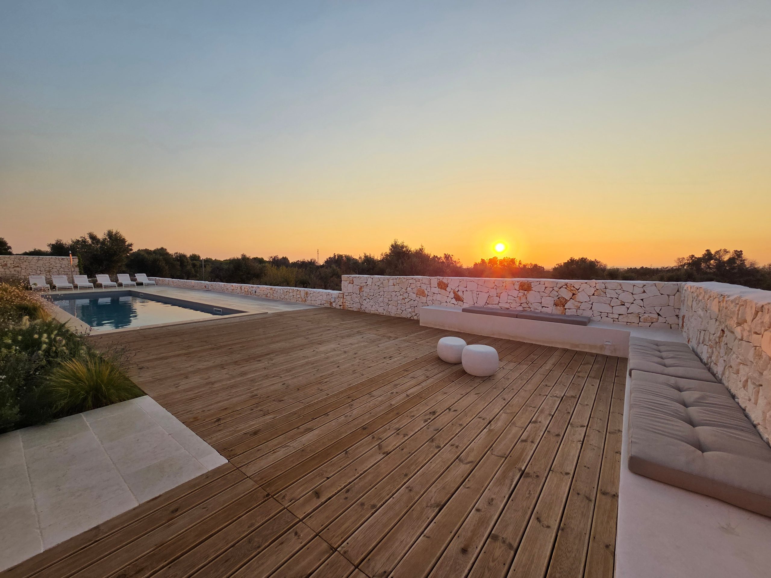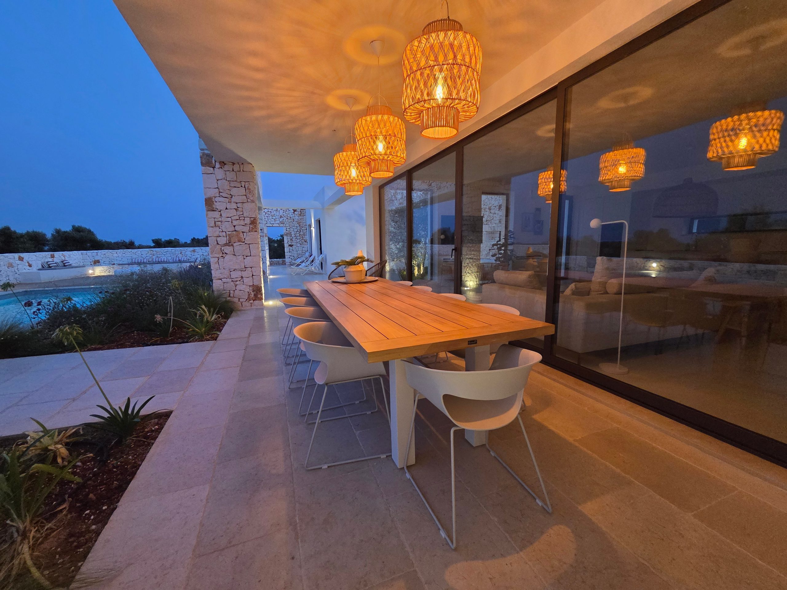 Around the villa, you’ll find a variety of seating areas. A large covered dining table for 10, perfect for unforgettable meals. Enjoy a cozy spot at the bar by the outdoor kitchen (autumn 2025), or relax on the beautiful, spacious sofa on the wooden terrace. Or retreat to the Mediterranean patio for a moment of peace.