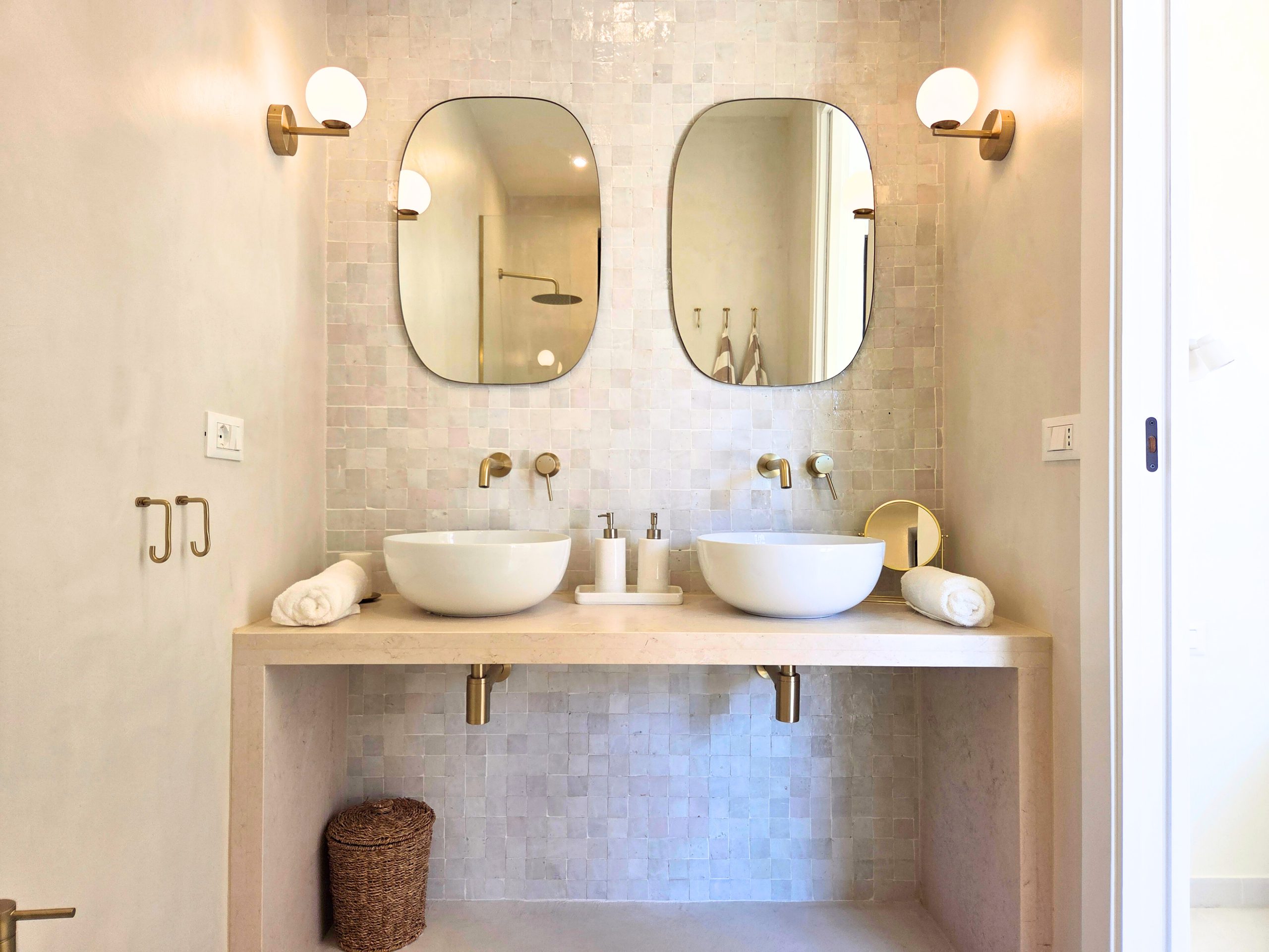 Serene double room with crisp linens, soft hues, and calming light. A peaceful retreat that invites pure relaxation – complete with distant sea views. The detached bathroom features a double washbasin, handcrafted Zellige tiles, and elegant golden details in the taps and accessories.